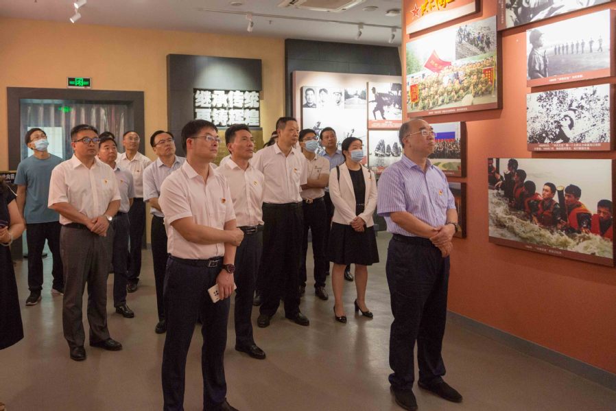 新四军“刘老庄连”曾受到习近平总书记的称赞,他在纪念中国人民抗日战争暨世界反法西斯战争胜利75周年座谈会讲话中指出,新四军“刘老庄连”等众多英雄群体,就是千千万万抗日将士的杰出代表。刘老庄八十二烈士先后入选全国“双百”人物和第一批著名抗日英雄群体。在伟岸庄严的纪念碑前,烈日下,全体党员集体向英勇献身的烈士敬献花篮、致默哀,面向党旗,举起右拳,面向鲜红的党旗重温入党誓词,发出了为共产主义奋斗终身的铮铮誓言。