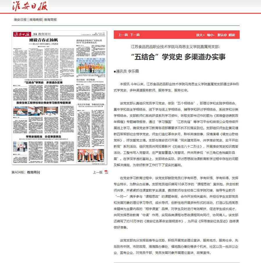 该党支部认真组织党员学习党史,做到“五个相结合”,即理论学和实践学相结合、集中学和自主学相结合、线下学与线上学相结合、辅导学和研讨学相结合、系统学和分类学相结合。支部教师们系统研读系列学习资料,听取支部书记作的题为《苦难奋进铸就百年辉煌》专题辅导报告,通过“学习强国”“江苏先锋”等学习平台和微信公众号持续开展线上学习,确保党史学习教育各项部署要求不折不扣落实到位。支部组织师生赴黄花塘新四军军部纪念馆学党史,师生们追忆革命岁月,聆听英雄故事,深情演唱《唱支山歌给党听》,抒发爱党之情。支部与淮安农行开展“同庆建党百年、共学淮安党史、实干开创新局”系列活动,组织党员共同观看影片《刘老庄八十二烈士》,开展淮安党史知识竞答活动,工整书写入党誓词,庄严宣誓重温入党誓词,并共同参观“长三角红色档案珍品展”。在学深学透的基础上,支部结合实际,研讨思想政治课教育教学过程中存在的问题及解决措施,为做好教学工作打下了坚实的基础。