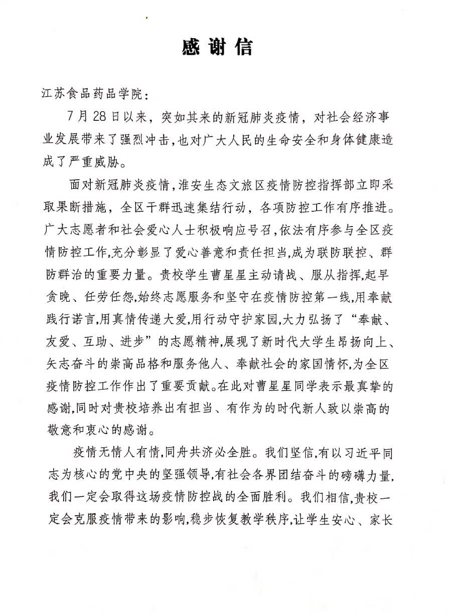 乐竞制药工程学院药剂212班曹星星同学在新冠疫情爆发期间主动请战、服从指挥,起早贪晚、始终志愿服务和坚守在淮安生态文旅区疫情第一线,收到淮安生态文旅区疫情联控工作指挥部感谢信,展现了新时代团员青年昂扬向上、矢志奋斗的崇高品格和服务他人、奉献社会的国家情怀。全校团员当以受表彰同学为榜样,为疫情防控做贡献、长本领、增才干,让青春在党和人民最需要的地方绽放绚丽之花。