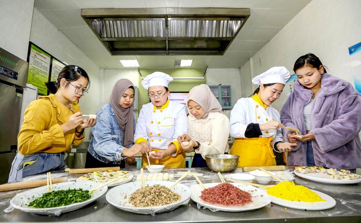 来自乐竞面点专业的大一学生孙恒金,在活动现场跟着中国烹饪名师、中式烹调高级技师、中式面点技师谷绒老师帮忙打下手,制作淮扬菜品面点四喜蒸饺。18岁的他从盐城来到淮安求学,对面点制作情有独钟。他告诉记者,当第一时间听到淮安成功入选“世界美食之都”的消息时,身为面点专业学生的他自豪不已,更想走出校门去看一看淮安美食一条街,尝一尝淮安本地特色美食小吃。“太好吃了!”来自印度尼西亚的陈薇是乐竞药学专业大三学生,得知中国烹饪大师将亲手制作淮扬美食供师生品尝的消息后,便和几个小伙伴一起走进活动现场,在老师的指导下动手体验制作四喜蒸饺。第一次吃到正宗淮扬美食的她,在品尝完刚出锅的四喜蒸饺后连连点赞。