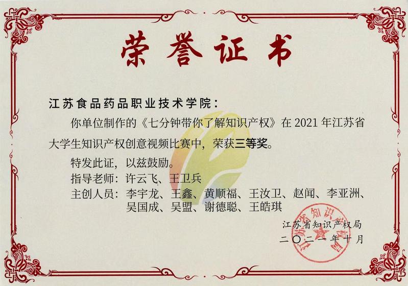 由江苏省知识产权局、江苏省教育厅、共青团江苏省委主办的2021年江苏省大学生知识产权赛事活动刚刚落幕,乐竞在该大赛创意视频比赛项目中,荣获三等奖。