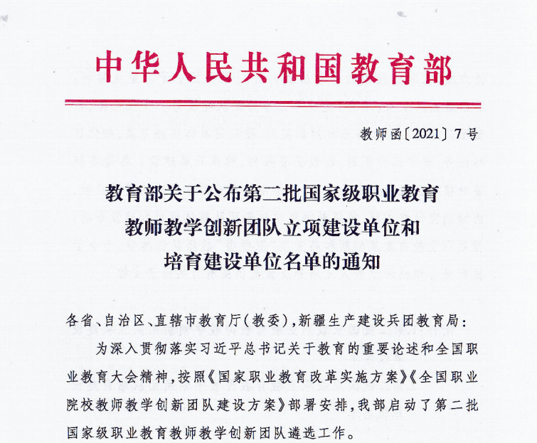 近日,《教育部关于公布第二批国家级职业教育教师教学创新团队立项建设单位和培育建设单位名单的通知》(教师函〔2021〕7号)公布了第二批国家级职业教育教师教学创新团队立项建设单位名单,乐竞成功入选第二批国家级职业教育教师教学创新团队立项建设单位,“食品检验检测技术”获批第二批国家级职业教育教师教学创新团队立项团队。第二批国家级职业教育教师教学创新团队立项建设单位共240个,江苏省共有13所高职院校入选。