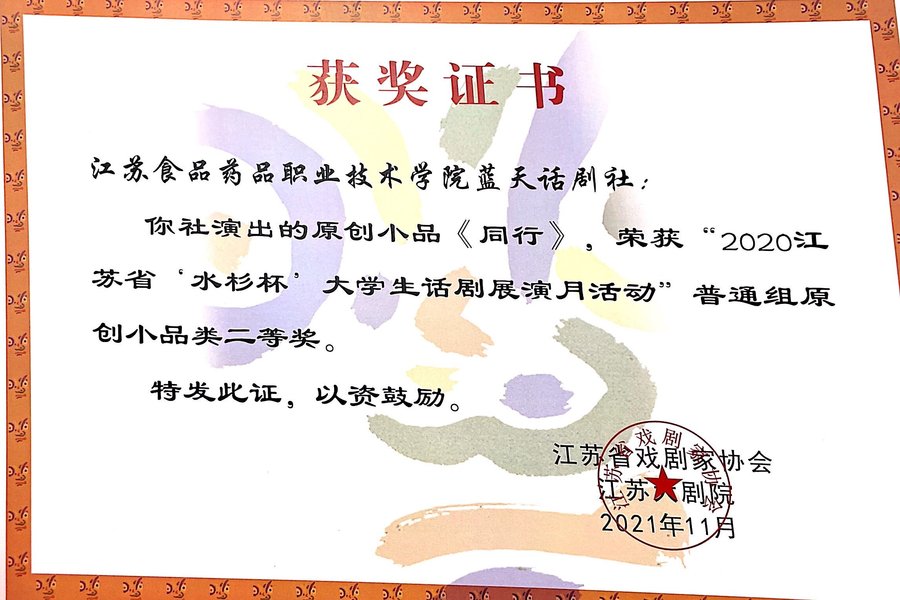 乐竞校团委广播站蓝天话剧社参与2020年“水杉杯”大学生话剧展演活动。经过十余月的评审,乐竞蓝天话剧社最终从参赛的多支队伍中脱颖而出,原创小品《同行》荣获“2020年江苏省‘水杉杯’大学生话剧展演月活动”普通组原创小品类二等奖和最佳剧本奖。