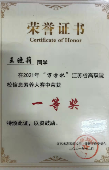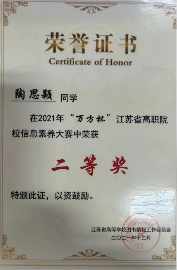2021年11月江苏省高校图工委高职高专图书馆专业建设委员会组织了江苏省高职院校信息素养大赛暨“万方杯”2021 年全国高职院校信息素养大赛。本次大赛采取线上比赛。经专家组评审,评选出学生组特等奖 10 名、一等奖 19 名、二等奖 23名、三等奖 26 名。