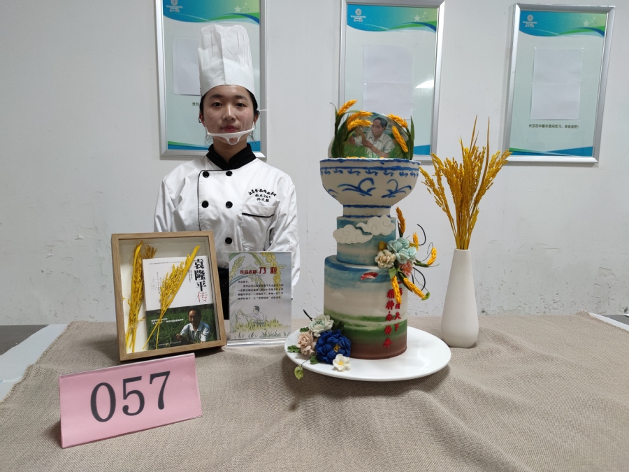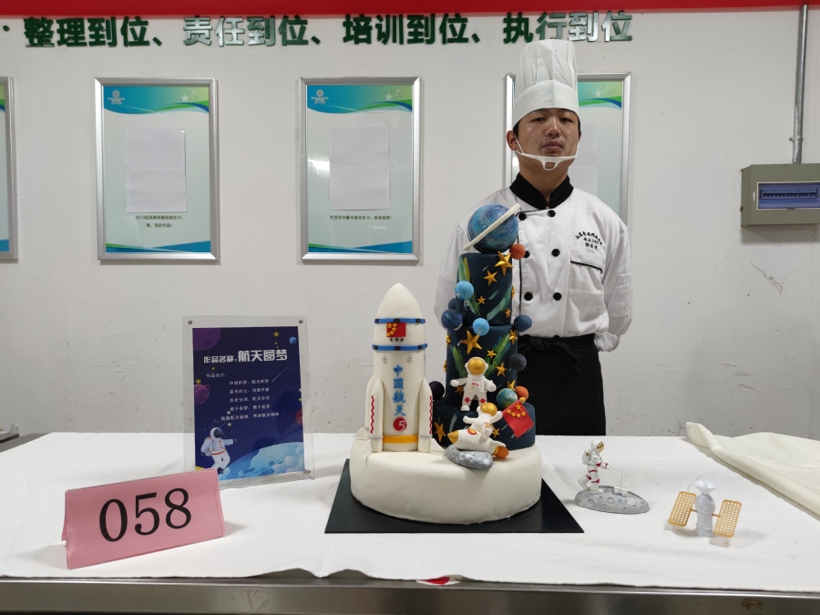 本次大赛因疫情的特殊性,采用了全程网络直播的形式,要求选手在2小时内制作一款装饰西点,主题不限。回顾本次比赛,团队老师全程参与指导工作,并在学生设计作品阶段时,积极献策,将国家热点的思政元素充分地融入到比赛作品中,巧妙地用创意裱花蛋糕的形式宣传了“袁梦精神” “航天精神”“全面建成小康”等。