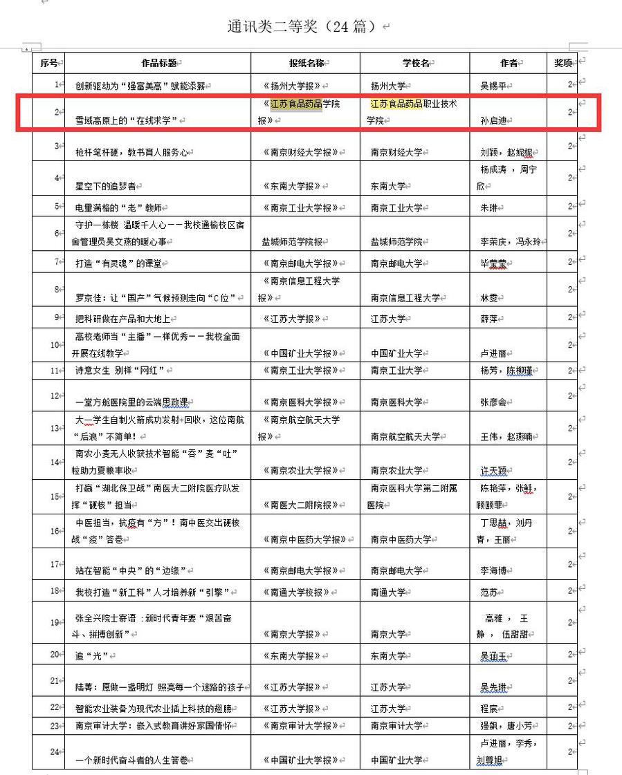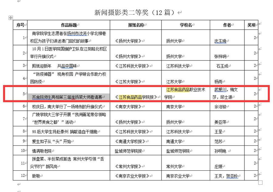 江苏省高校校报2020年度优秀作品评选工作于近日揭晓,乐竞《雪域高原上的“在线求学”》获通讯类二等奖,《苏食院师生亮相第三届淮扬菜大师邀请赛》获新闻摄影类二等奖。