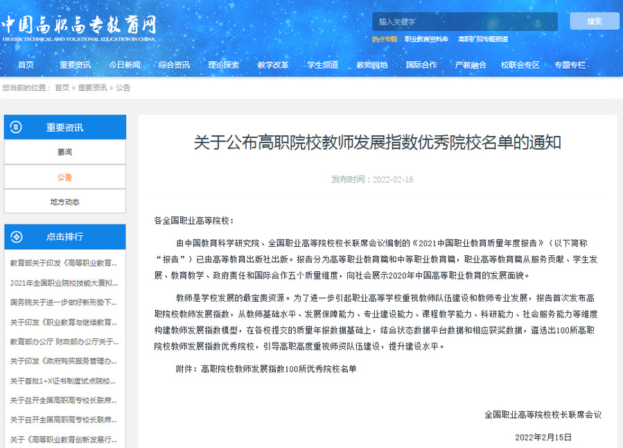 近日,由中国教育科学研究院、全国职业高等院校校长联席会议编制的《2021中国职业教育质量年度报告》(以下简称“报告”)已由高等教育出版社出版。报告首次研制发布了高职院校教师发展指数,乐竞成功入选高职院校教师发展指数100所优秀院校名单。