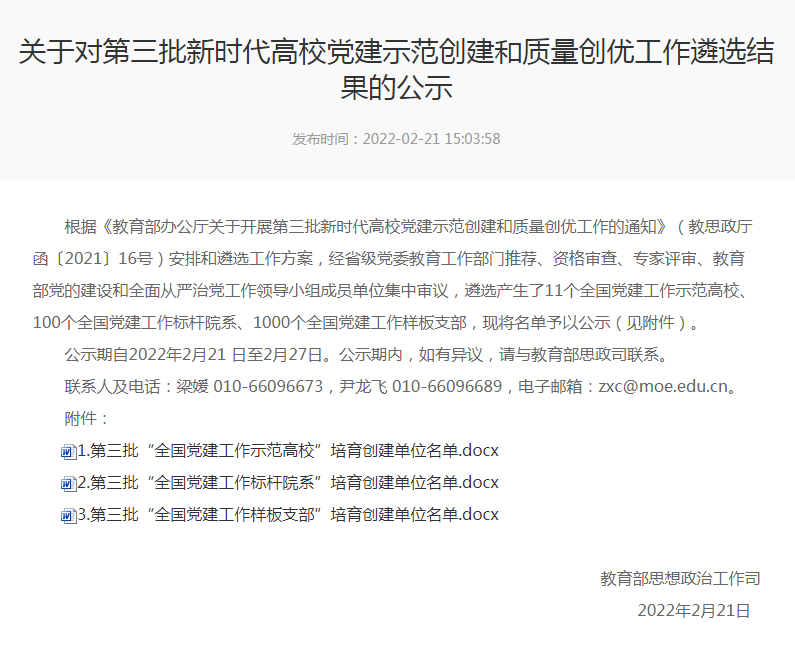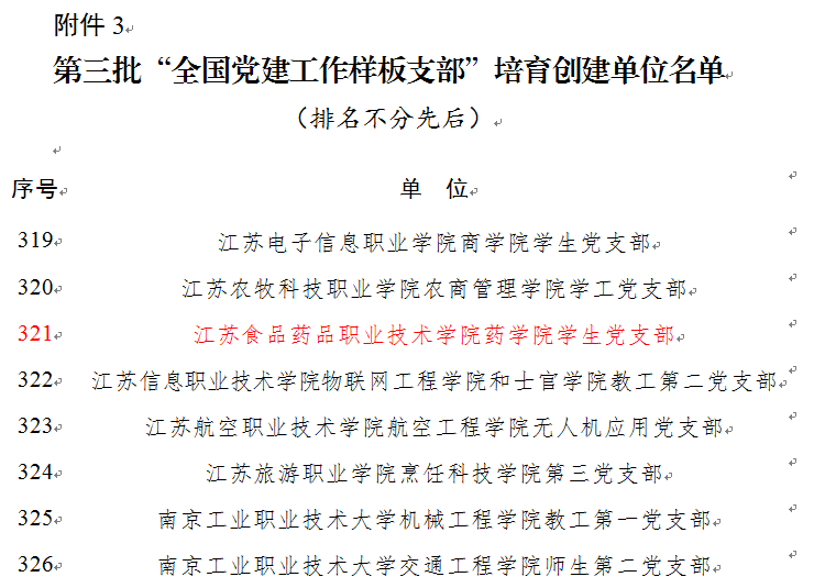 本次评选根据《教育部办公厅关于开展第三批新时代高校党建示范创建和质量创优工作的通知》(教思政厅函〔2021〕16号)安排和评审工作方案,经省级党委教育工作部门推荐、资格审查、专家评审、教育部党的建设和全面从严治党工作领导小组成员单位集中审议,最终遴选产生。药学院学生党支部最终获得了此项殊荣。