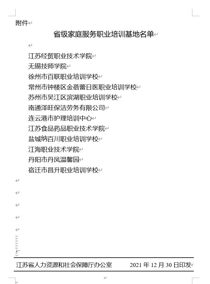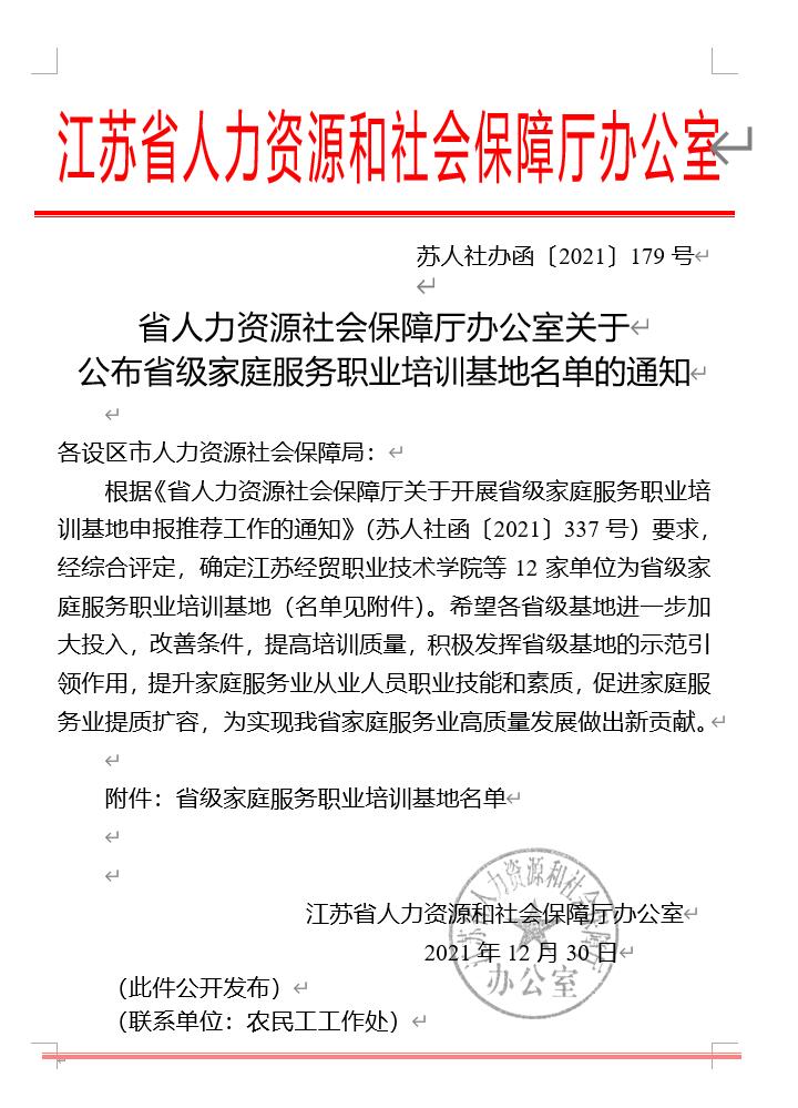 根据《省人力资源社会保障厅关于开展省级家庭服务职业培训基地申报推荐工作的通知》(苏人社函〔2021〕337号)要求,经综合评定,乐竞被确定为省级家庭服务职业培训基地。