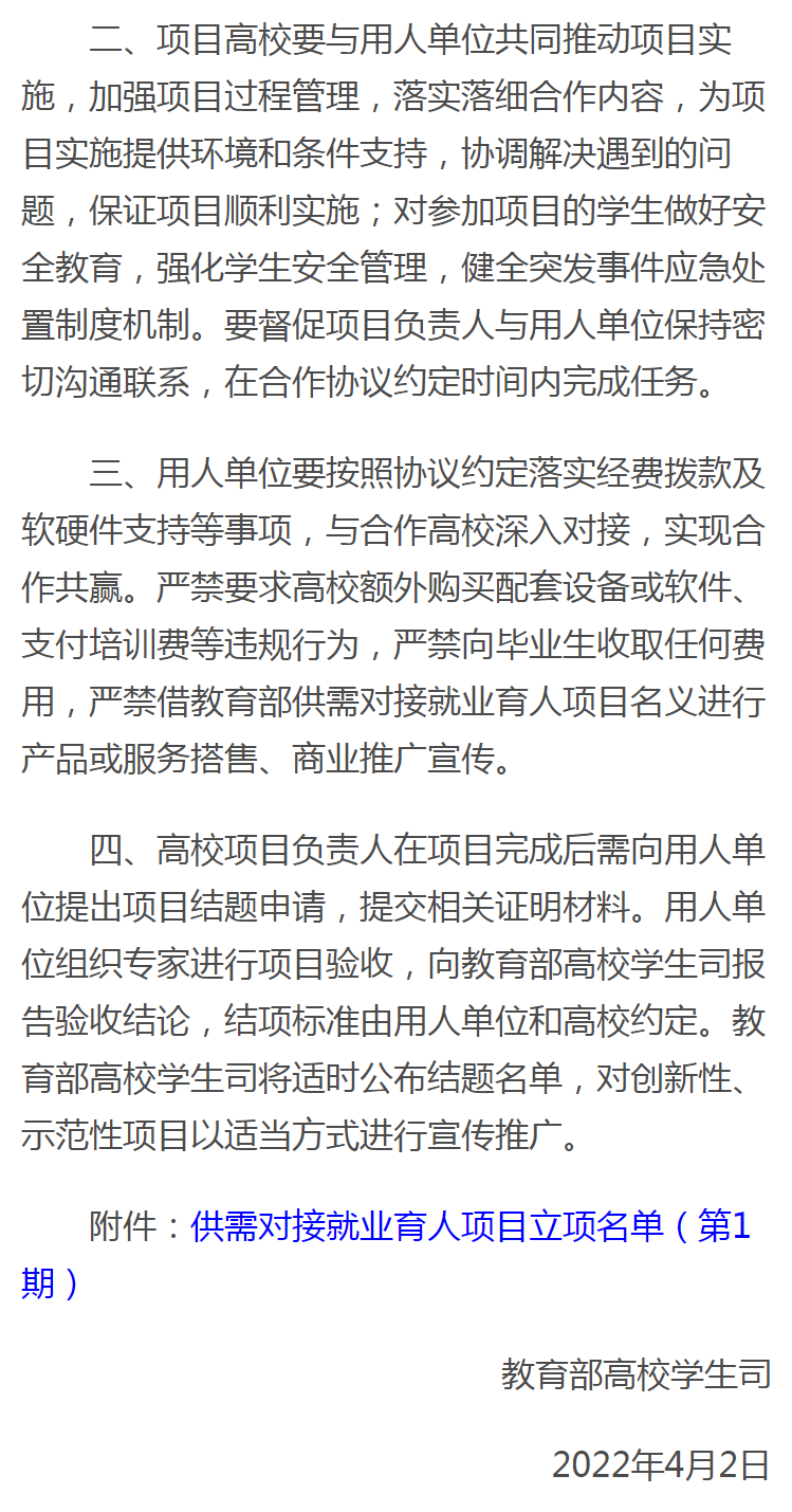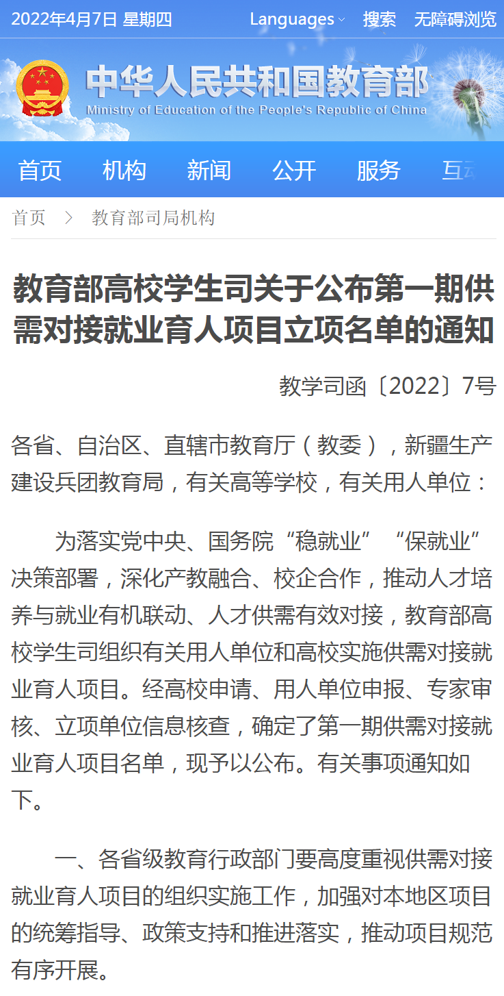 近日,《教育部高校学生司关于公布第一期供需对接就业育人项目立项名单的通知》(教学司函〔2022〕7号)公布了教育部第一期供需对接就业育人项目立项名单,乐竞烹饪工艺与营养专业群与上海亚湾酒店管理有限公司合作申报的“亚湾国际高端酒店班”定向人才培养项目获教育部立项,全国各类高等院校同时获教育部立项的项目共6369项。