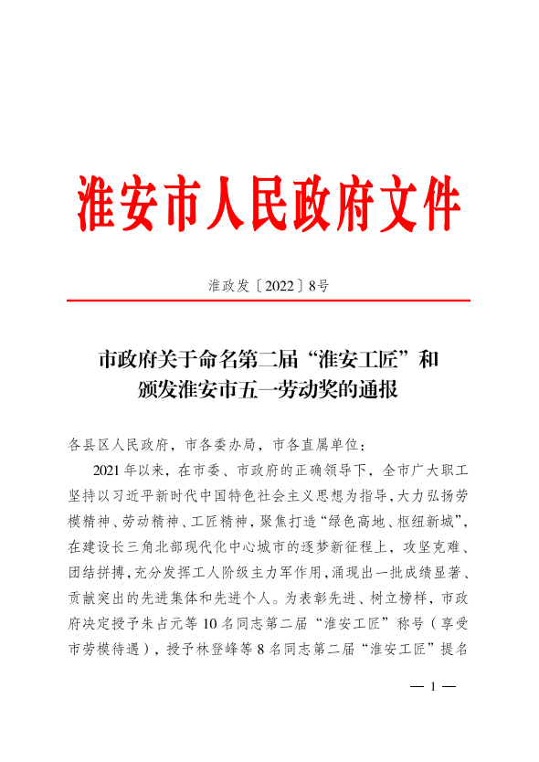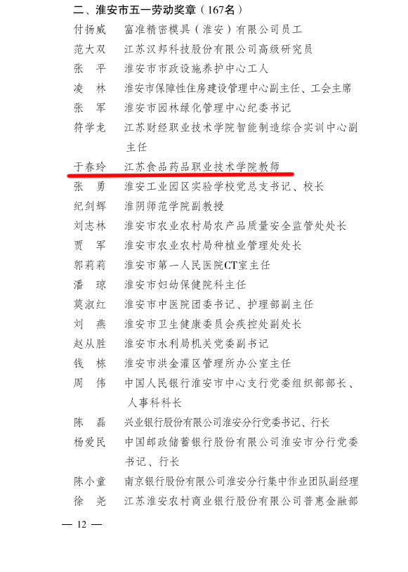 4月27日,淮安市人民政府发布了《关于命名第二届“淮安工匠”和颁发淮安市五一劳动奖的通报》(淮政发〔2022〕8号),乐竞信息工程学院于春玲老师荣获“淮安市五一劳动奖章”荣誉称号。