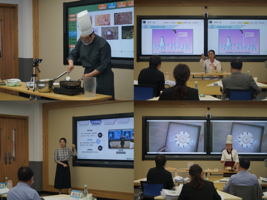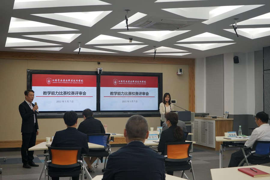 评审会由驻淮高职院校的校领导及教务处负责人担任评审专家。学校23支参赛队伍分别介绍了参赛作品的教学实施报告,对教案中的自选内容进行无学生教学展示,最后评委进行提问及点评。评委一致认为乐竞参赛作品围绕大健康和食品安全,既充分展示了所属院部特色,又宣传和弘扬了传统文化。评委对作品给予高度评价的同时也给出三点建议:第一,实施报告和教案撰写要注意二者的契合;第二,参赛作品要注重内容的选取和亮点的打造;第三,建议跨专业跨学院组队,实现优势互补。