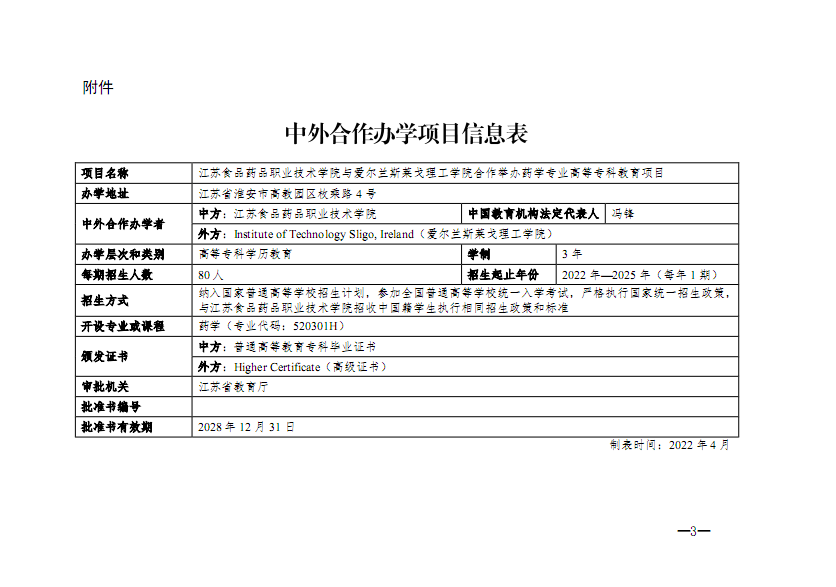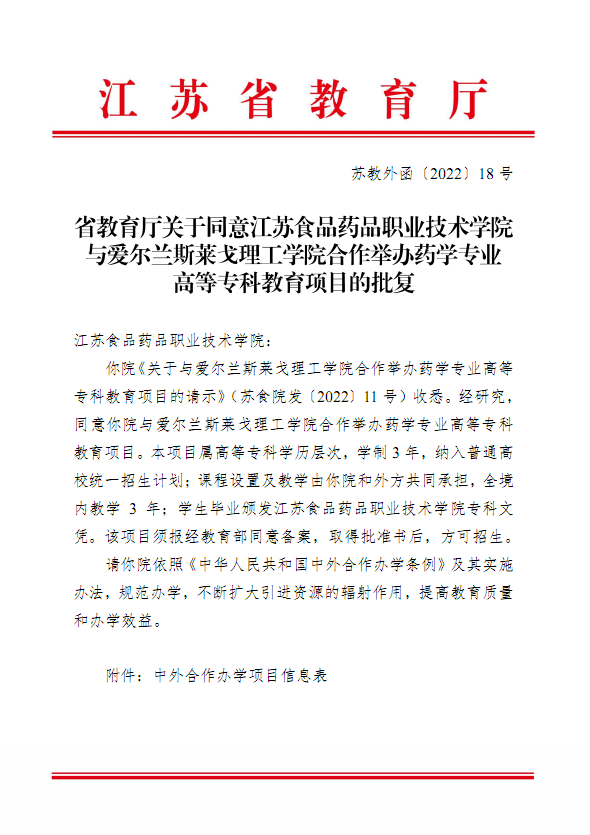 近日,江苏省教育厅公布2022年上半年中外合作办学项目审批结果,乐竞与爱尔兰斯莱戈理工学院合作举办药学专业高等专科教育项目正式获批,这是乐竞“十四五”期间首个中外合作办学项目。