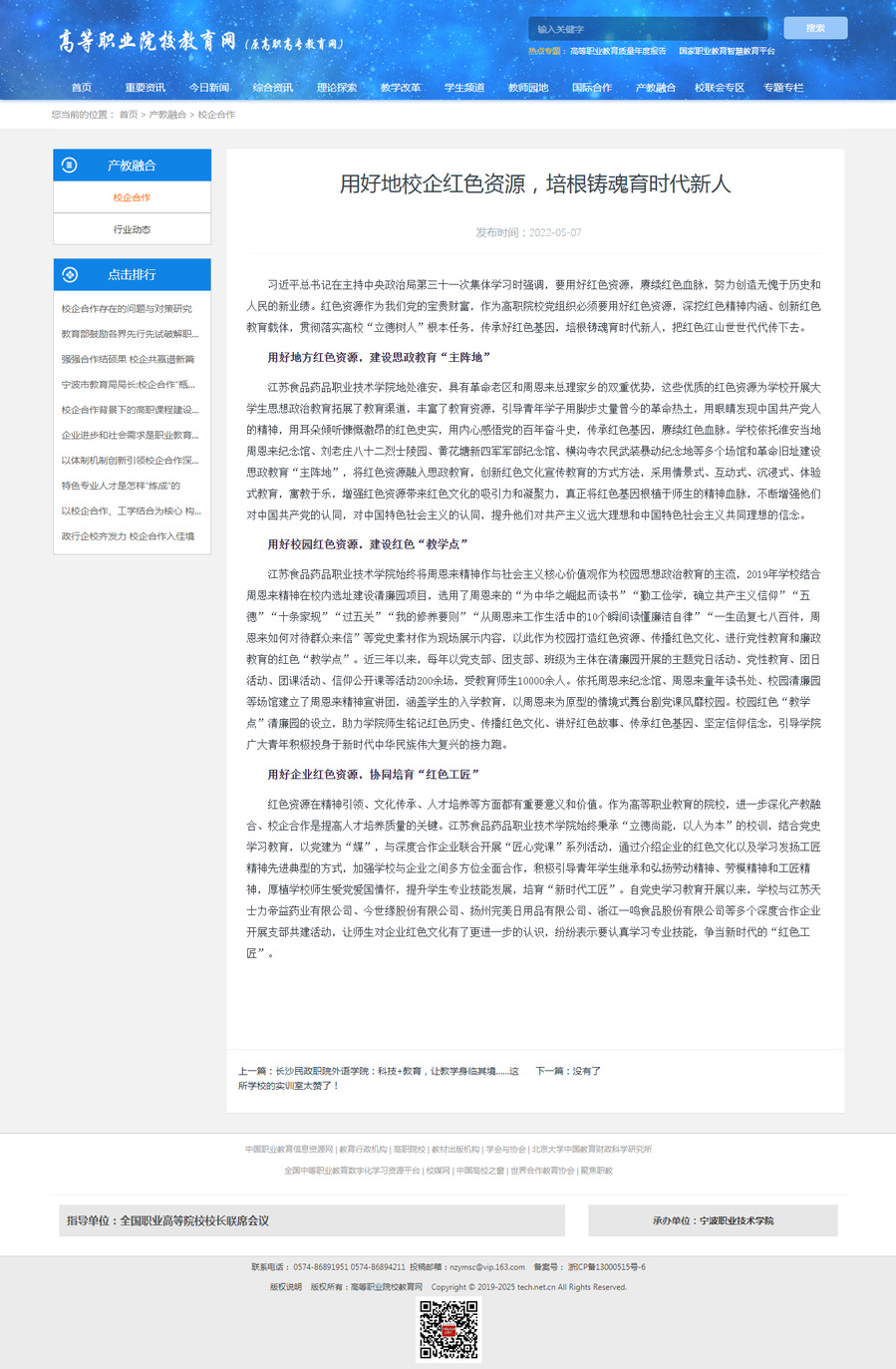 红色资源在精神引领、文化传承、人才培养等方面都有重要意义和价值。作为高等职业教育的院校,进一步深化产教融合、校企合作是提高人才培养质量的关键。乐竞始终秉承“立德尚能,以人为本”的校训,结合党史学习教育,以党建为“媒”,与深度合作企业联合开展“匠心党课”系列活动,通过介绍企业的红色文化以及学习发扬工匠精神先进典型的方式,加强学校与企业之间多方位全面合作,积极引导青年学生继承和弘扬劳动精神、劳模精神和工匠精神,厚植学校师生爱党爱国情怀,提升学生专业技能发展,培育“新时代工匠”。自党史学习教育开展以来,学校与江苏天士力帝益药业有限公司、今世缘股份有限公司、扬州完美日用品有限公司、浙江一鸣食品股份有限公司等多个深度合作企业开展支部共建活动,让师生对企业红色文化有了更进一步的认识,纷纷表示要认真学习专业技能,争当新时代的“红色工匠”。