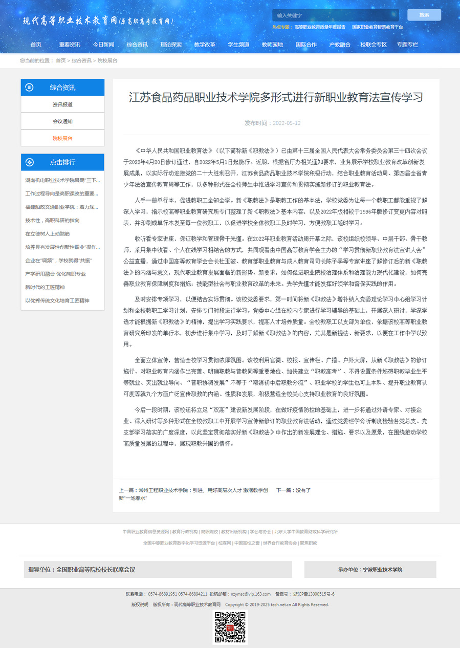全面立体宣传,营造全校学习贯彻浓厚氛围。该校利用官微、校报、宣传栏、广播、户外大屏,从新《职教法》的修订施行、对职业教育内涵作出完善、明确职教与普教同等重要地位、加快建立“职教高考”、不得设置条件妨碍职教毕业生平等就业、突出就业导向、“普职协调发展”不等于“取消初中后职教分流”、职业学校的学生也可上本科、提升职业教育认可度等就九个方面广泛宣传职教的内涵、性质和发展,积极营造全校关心支持职业教育的良好氛围。