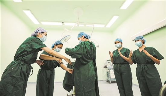5月8日,在位于江苏淮安市的乐竞护理学院,老师在模拟手术室教授学生穿脱手术衣。赵启瑞 摄