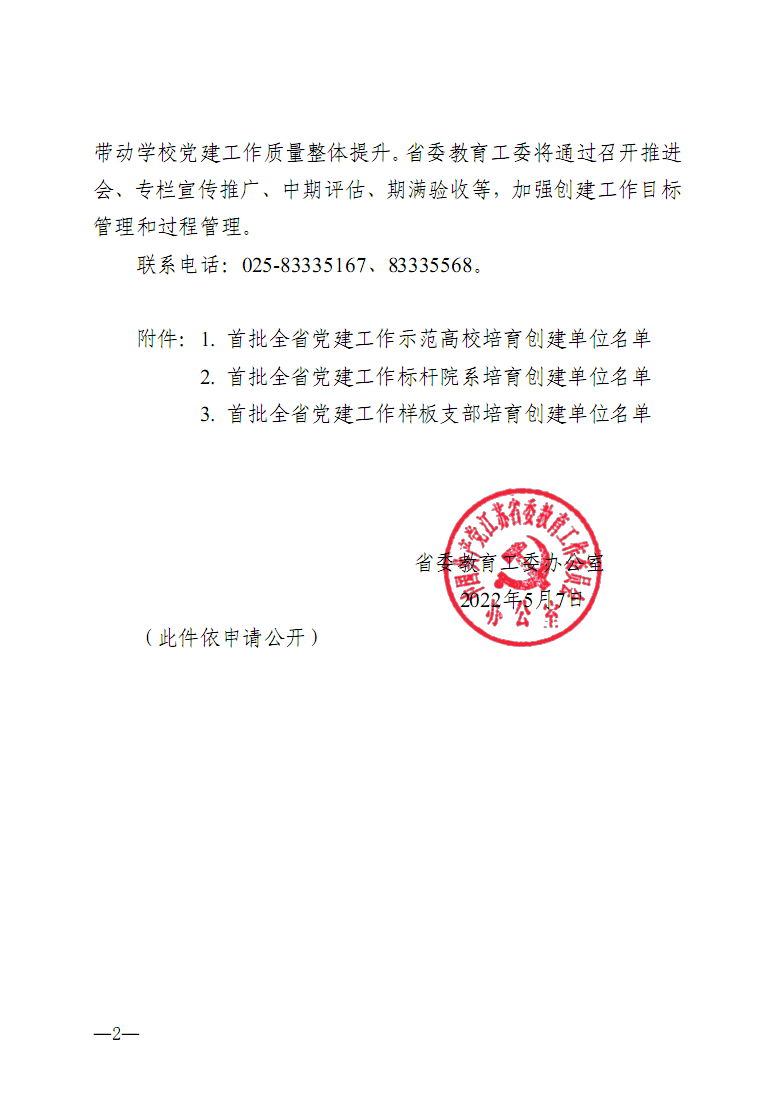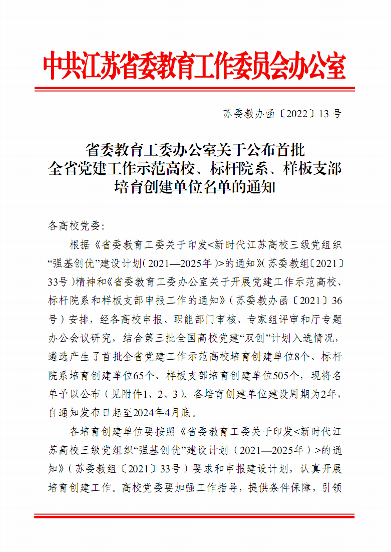 自江苏省委教育工委启动了新时代江苏高校三级党组织“强基创优”建设计划(2021-2025年)以来,学校党委带领全校基层党组织严格对标“党建工作标杆院系”“党建工作样板支部”建设标准,坚持创优争先,从组织力提升、党支部创新、党员先锋模范作用发挥等方面大力推进党建品牌创新和示范创建培育工作。学校党建工作在“质”和“量”上都有较大幅度提升,党建引领事业发展成效日益显现。