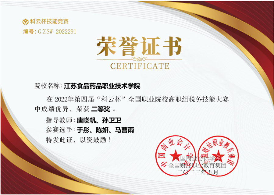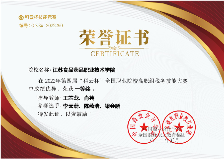 近日,由中国商业会计学会、全国财经职业教育集团主办,中国商业会计学会职业教育分会协办,厦门科云信息科技有限公司承办的2022年第四届“科云杯”全国职业院校高职组税务技能大赛在云端圆满落下帷幕。乐竞财贸学院王芯蕊、肖芸老师指导的李云蔚、陈燕浩、梁会鹏参赛团队荣获一等奖;唐晓帆、孙卫卫老师指导的于彤、陈妍、马曹雨参赛团队荣获二等奖。
