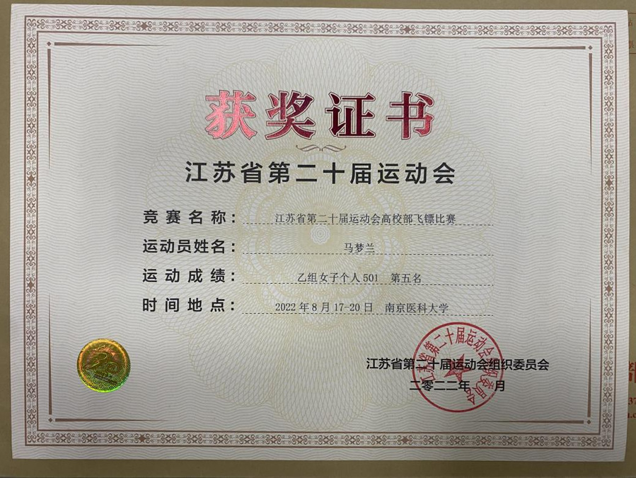 本次飞镖比赛是第一次被列为江苏省第二十届运动会的比赛项目,乐竞功飞镖队由体育教学部朱懿奇老师指导并带领参加本次比赛。经过激烈而紧张的比赛,乐竞康复203班马梦兰同学获得了女子单人第五名。