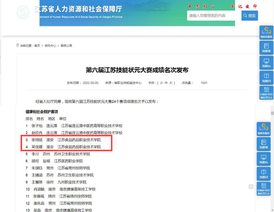 近日,江苏省人力资源和社会保障厅发布了第六届江苏技能状元大赛成绩,乐竞21级护理专业张栩铭、吴佳媛两位同学以扎实的专业理论知识、良好的沟通、人际交往能力和沉着稳定的发挥,从11支地市代表队22名参赛选手中脱颖而出,分别荣获第三名、第四名。