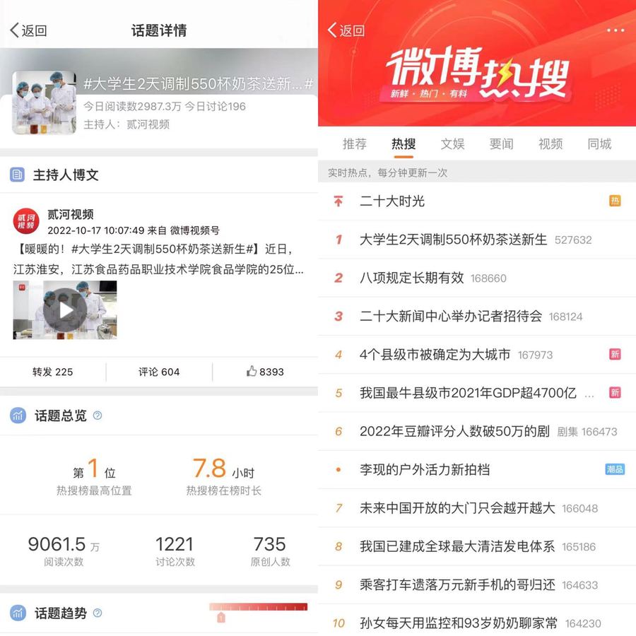 该新闻视频微博阅读达9061.5万人次,讨论超过1000条,发布媒体45家,热搜榜第1位。网友热评“感觉好好喝,羡慕了”“学以致用,真材实料”“好有爱的学校,好有爱的学长学姐”。
