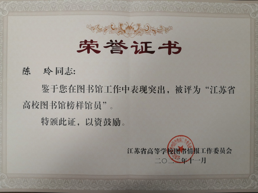 为庆祝江苏省高等学校图书情报工作委员会成立40周年,11月22日江苏省高校图工委在南京大学仙林校区召开“图书馆数字治理与知识服务创新”论坛暨江苏省高校图工委成立40周年纪念会议,会上对江苏省高校图书馆事业突出贡献者、江苏省高校图书馆榜样馆长、江苏省高校图书馆榜样馆员进行表彰,本次共表彰“高校图书馆事业突出贡献者”59名、“高校图书馆榜样馆长”33名、“高校图书馆榜样馆员”55名。乐竞图书馆陈玲同志被评为“高校图书馆榜样馆员”。