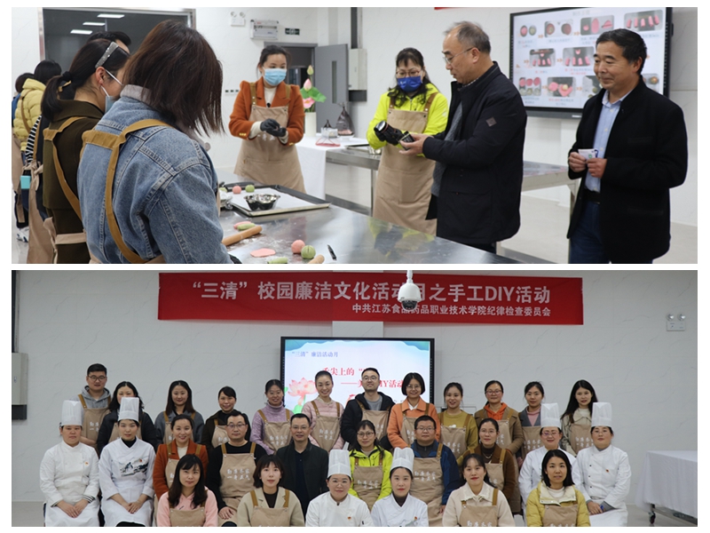 舌尖上的“廉”美食DIY活动。酒店学院党总支纪检委员谷绒老师与大家分享了明朝于谦清风两袖的廉洁典故,分析了荷花酥所蕴涵的廉洁内涵;面点专业刘溪老师为大家讲解并示范了荷花酥的配方、制作要点和方法技巧。接着,各位老师经过一系列的步骤后完成荷花酥的制作。