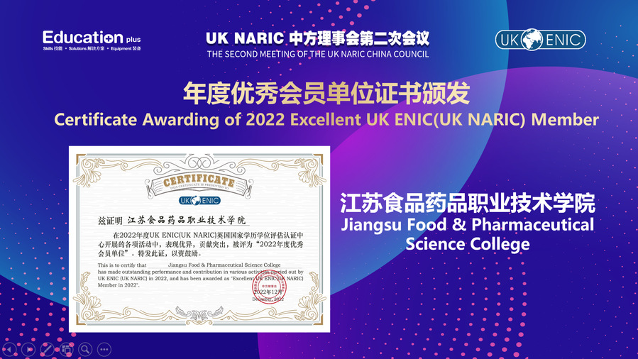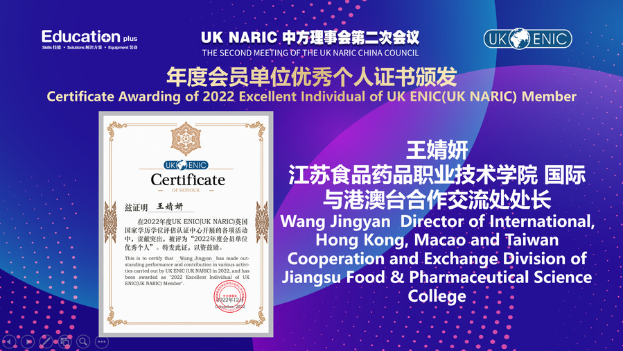 颁奖仪式上,乐竞被评为2022年度英国国家学历学位评估认证中心(UK NARIC)优秀会员单位,王婧妍同志被评为年度会员单位优秀个人。