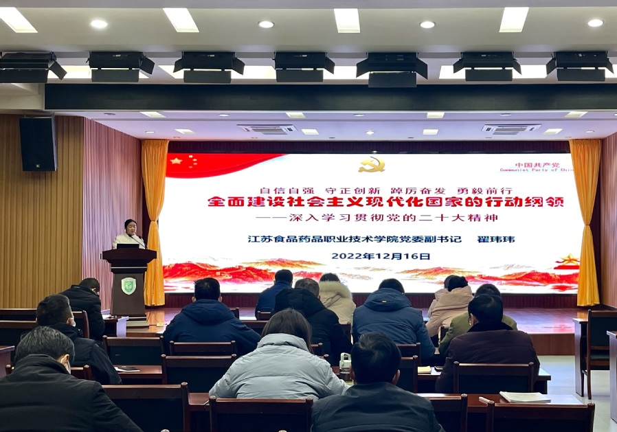 为深入学习贯彻党的二十大精神,12月16日下午,校党委副书记翟玮玮在第四会议室开展题为《自信自强守正创新踔厉奋发勇毅前行,全面建设社会主义现代化国家的行动纲领》的专题党课。食品学院党总支及机关党委第三党支部全体党员教师参加学习。