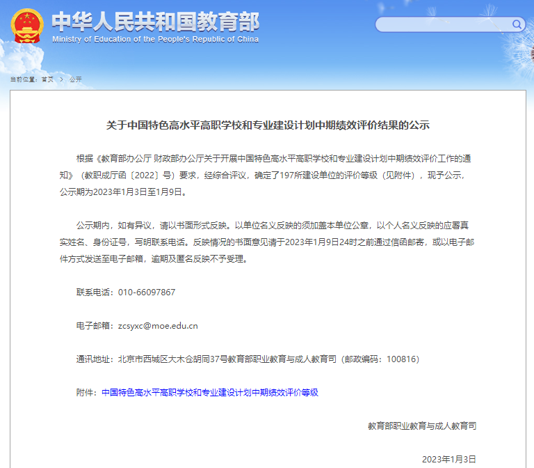 1月3日上午,教育部职业教育与成人教育司发布《关于中国特色高水平高职学校和专业建设计划中期绩效评价结果的公示》,根据《教育部办公厅财政部办公厅关于开展中国特色高水平高职学校和专业建设计划中期绩效评价工作的通知》(教职成厅函〔2022〕号)要求,经综合评议,确定了全国197所建设单位的评价等级,其中乐竞获评优秀。