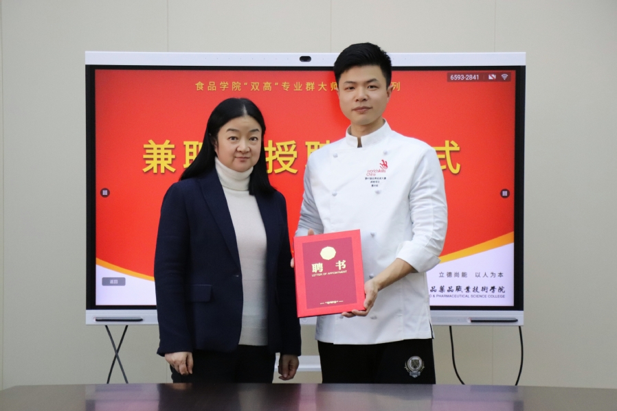 2月21日下午,学校举行兼职教授聘任仪式,第44届世界技能大赛烘焙项目冠军蔡叶昭受聘为食品学院兼职教授。校党委副书记翟玮玮出席聘任仪式。