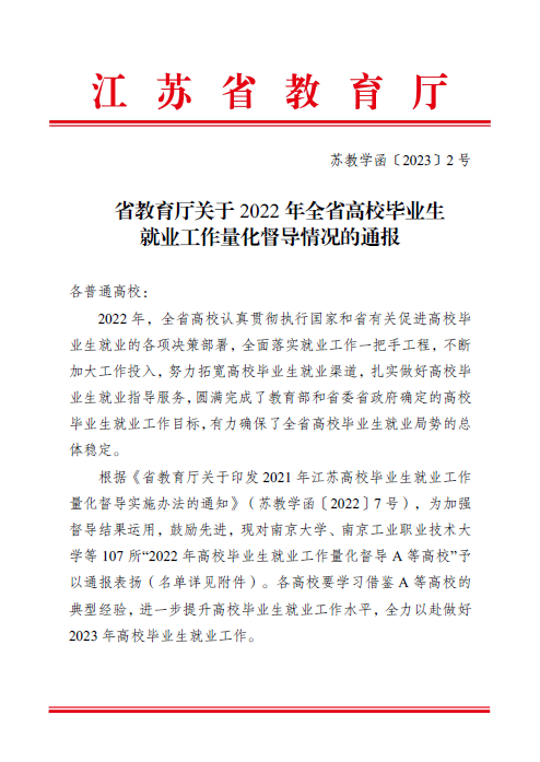 2月21日,江苏省教育厅印发了《关于2022年全省高校毕业生就业工作量化督导情况的通报》(苏教学函〔2023〕2号),乐竞再次获评“全省高校毕业生就业工作量化督导A等高校”,这也是乐竞连续三年获此殊荣。