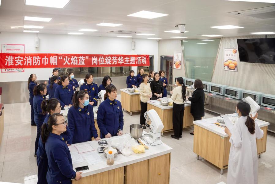 3月7日下午,在“三.八”国际妇女节即将来临之际,淮安市消防救援支队近30名优秀女干部、好消嫂在支队党委书记、政治委员徐菲菲带领下来乐竞学习烘焙技能,同时也开启了双方“党建共建,发展共赢”的序幕。校党委书记陶书中、副书记翟玮玮热情接待了来宾。