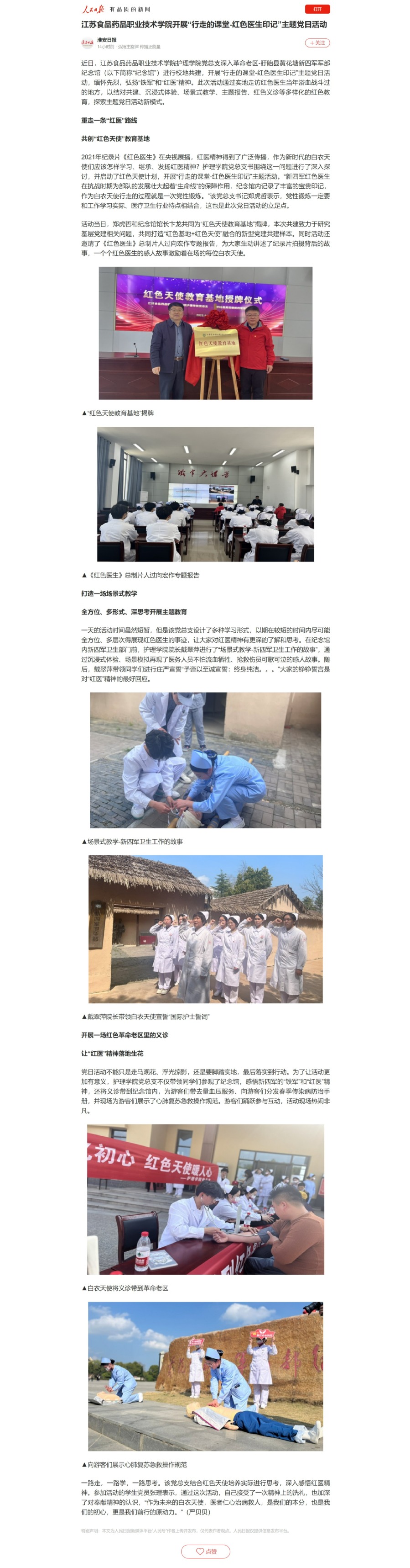 一路走,一路学,一路思考。该党总支结合红色天使培养实际进行思考,深入感悟红医精神。参加活动的学生党员张理表示,通过这次活动,自己接受了一次精神上的洗礼,也加深了对奉献精神的认识,“作为未来的白衣天使,医者仁心治病救人,是我们的本分,也是我们的初心,更是我们前行的原动力。”