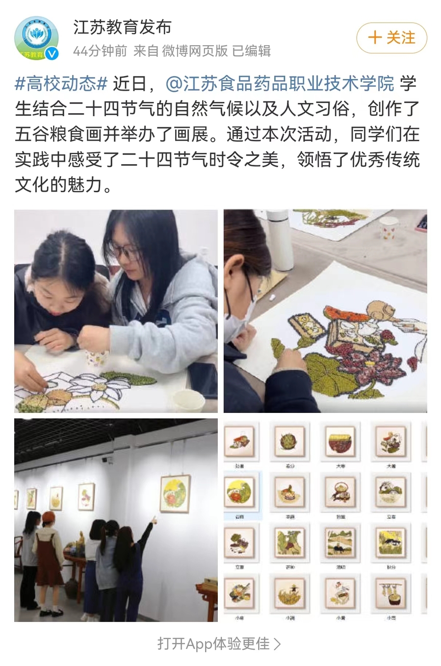 乐竞学生结合二十四节气的自然气候以及人文习俗,创作了五谷粮食画并举办了画展。通过本次活动,同学们在实践中感受了二十四节气时令之美,领悟了优秀传统文化的魅力。
