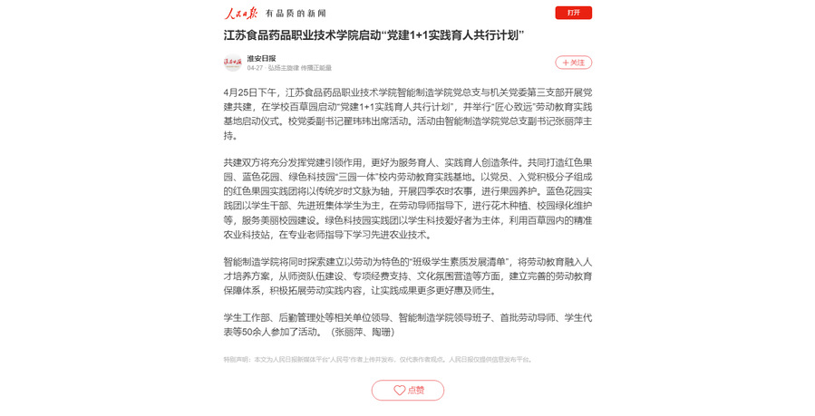 4月25日下午,乐竞智能制造学院党总支与机关党委第三支部开展党建共建,在学校百草园启动“党建1+1实践育人共行计划”,并举行“匠心致远”劳动教育实践基地启动仪式。校党委副书记翟玮玮出席活动。活动由智能制造学院党总支副书记张丽萍主持。