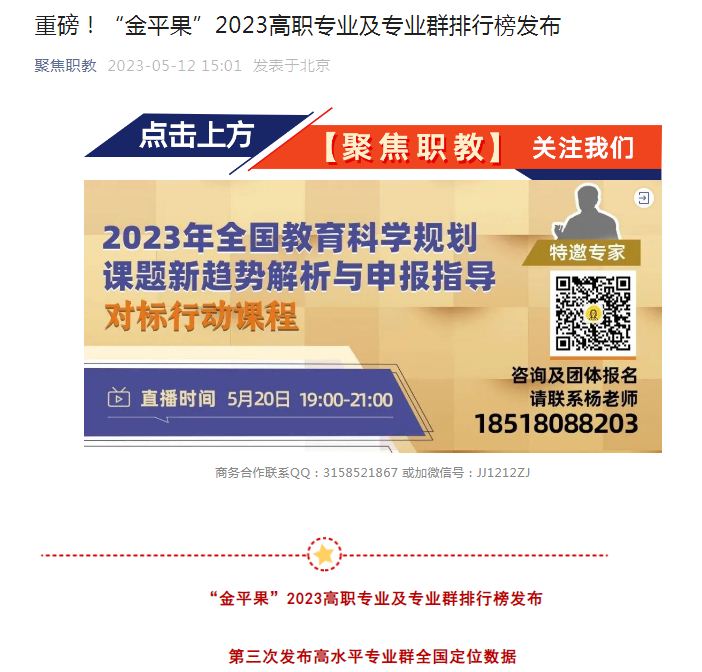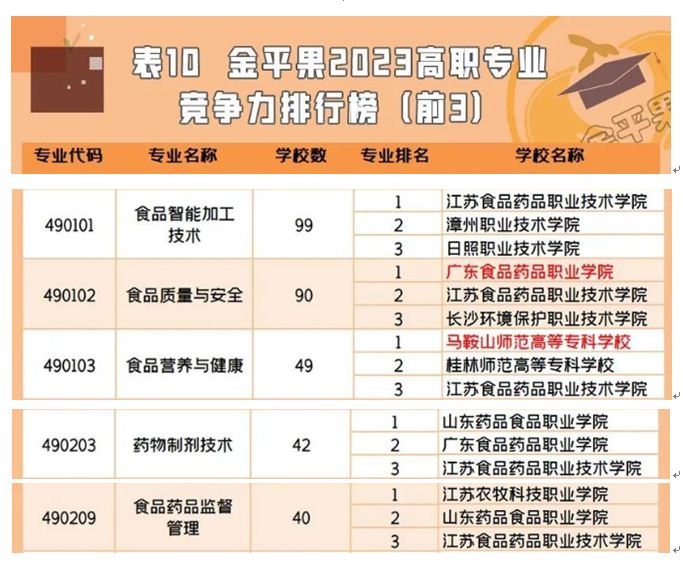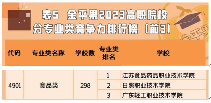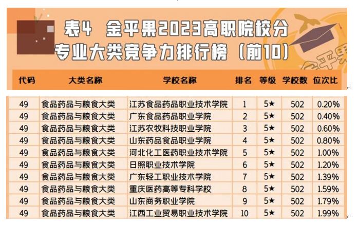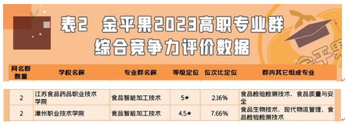“金平果”2023高职专业及专业群排行榜发布,乐竞食品智能加工技术专业群综合竞争力5★;食品药品与粮食专业大类竞争力排行第一;分专业食品类竞争力排行第一。