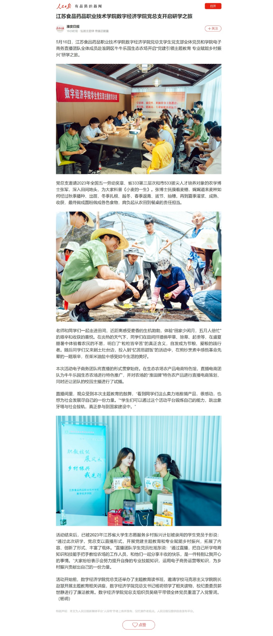 5月16日,乐竞数字经济学院党总支学生党支部全体党员和学院电子商务直播团队全体成员赴淮阴区牛牛乐园生态农场开启“党建引领主题教育 专业赋能乡村振兴”研学之旅。