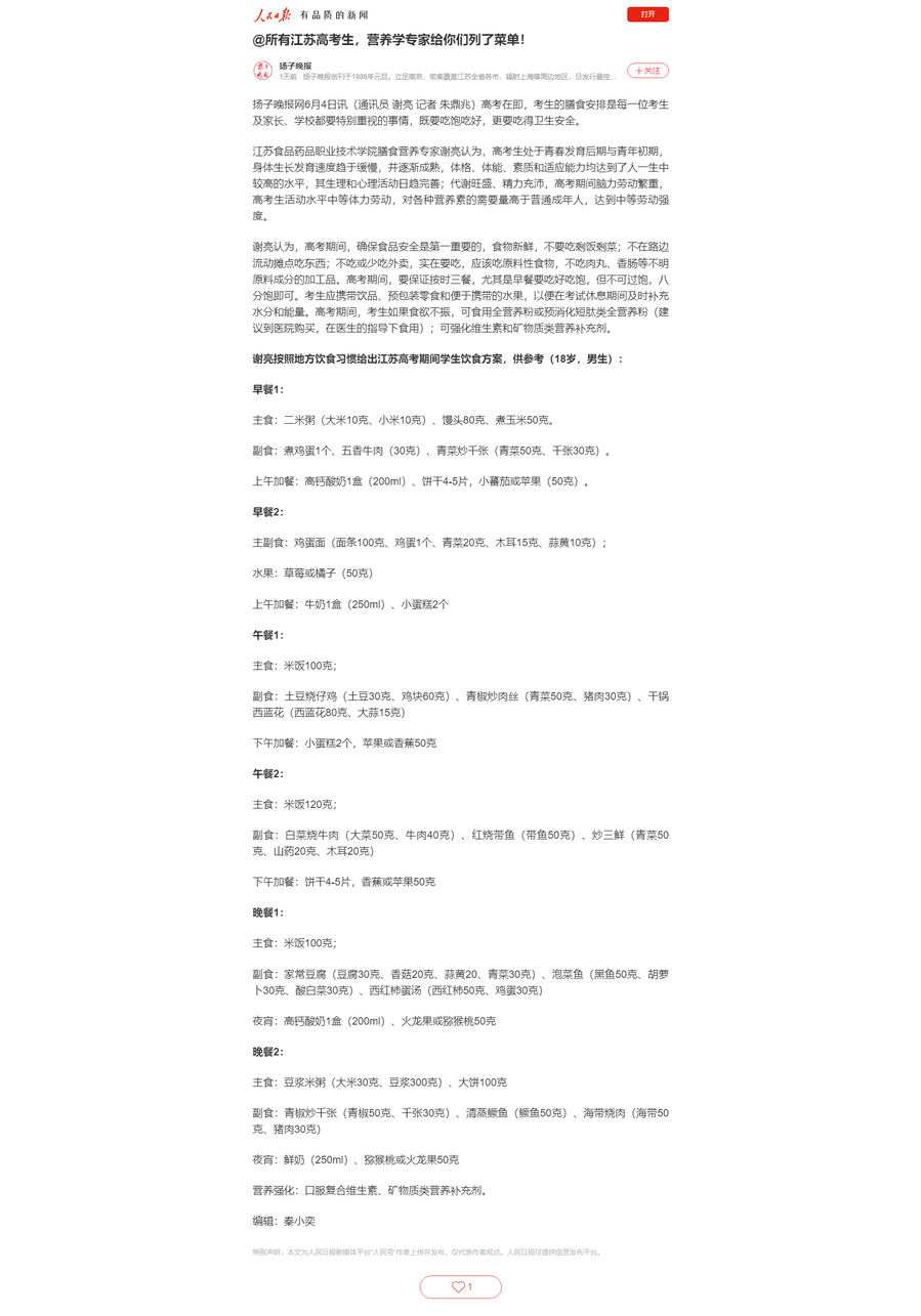 谢亮按照地方饮食习惯给出江苏高考期间学生饮食方案,供参考(18岁,男生):