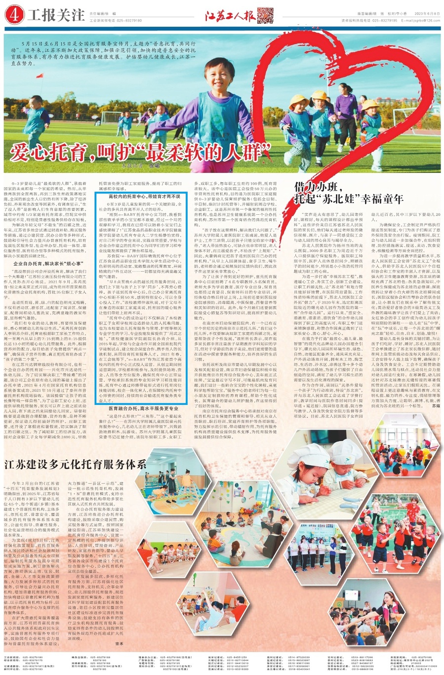 “托育中心的成功运行不仅解决了本校教职工子女和学校周边适龄幼儿的入托难问题,也为本校婴幼儿托育服务与管理、护理等相关专业学生的学习、专业技能发挥提供了‘用武之地’。”该校健康医学院副院长孙青介绍,从2015年起,学校与企业合作开展全国首批现代学徒制试点,建立校企深度合作、携手育人的长效机制,共同培育托育服务人才。2021年春,在工会统筹下,“e-BABY”作为江苏省首个高校内的托育中心正式投入运营。从创立期间到运营期间,学校都积极参与,及时提供场地、资金、人员等全方位服务,确保托育中心正常运营。学校承担系统的专业知识学习和技能训练,托育中心通过师傅带徒形式进行托育岗位技能训练,校企一体化育人,在保障校内托育中心师资的同时,持续向社会输送托育服务类专业人才。