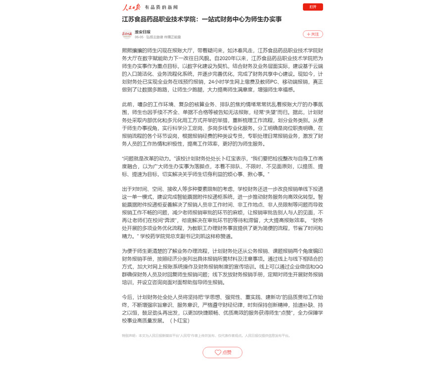 出于对时间、空间、接收人等多种要素限制的考虑,学校财务还进一步改良报销单线下投递这一单一模式,建设完成智能票据附件投递柜系统,进一步推动财务服务向高效化转型。智能票据附件投递柜妥善解决了报销人员非工作时间、非工作地点、非人员限制等问题而导致报销工作不畅的问题,减少老师报销审批的环节的麻烦,让报销审批告别人与人的见面,不再让老师们在校间“奔波”,彻底解决在审批环节的等待和滞留,大大提高报账效率。 “财务处开展的多项业务优化流程,为教职工办理财务事宜提供了更为简便的流程,节省了时间和精力。” 学校药学院党总支副书记刘凯这样称赞道。