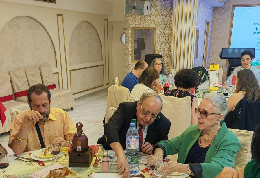 当地时间6月28日晚,丁玉勇教授与无锡商业职业技术学院陈金标副教授、苏州吴门人家酒店厨师长张书超一同在巴黎国际大酒店制作品鉴宴会,联合国教科文组织直属协会主席玛赫达、中国驻联合国教科文组织副大使王盈、多名烹饪国际评委和多国驻联合国教科文组织官员共60多人现场品鉴了宴席菜肴,丁玉勇教授制作的清炖鸭方、平桥豆腐配茶馓、藕粉圆子、淮扬米糕等菜点受到了评委和来宾的一致好评。