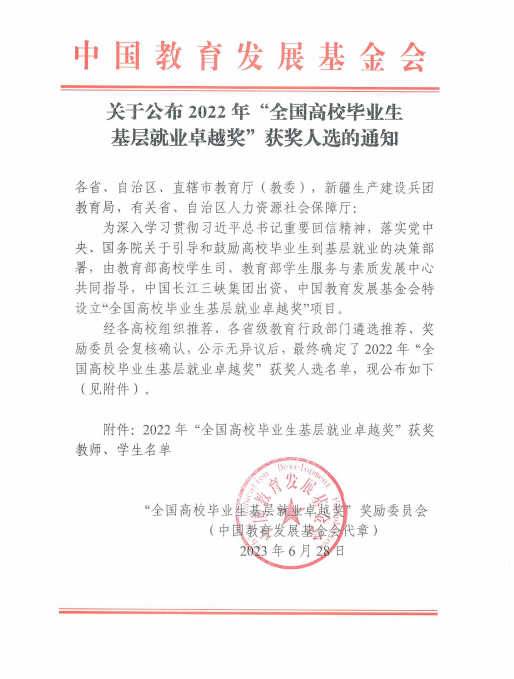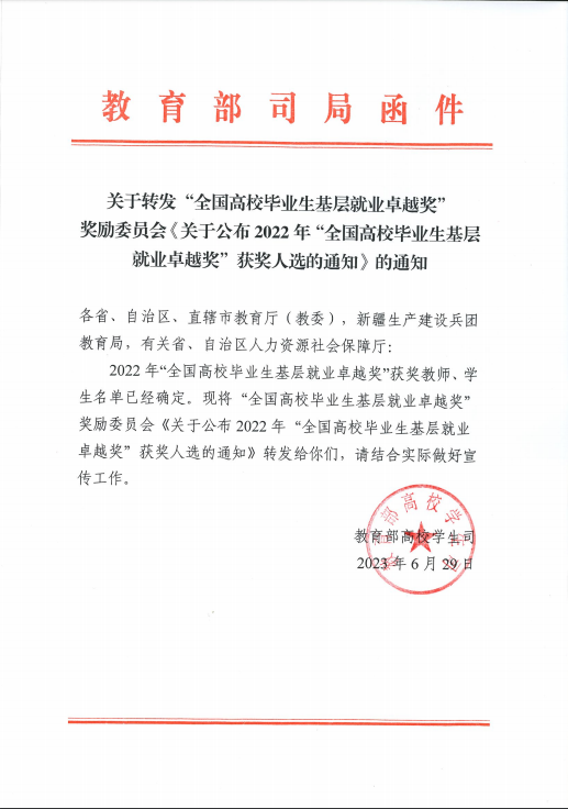 乐竞学生王猛荣获“全国高校毕业生基层就业卓越奖”