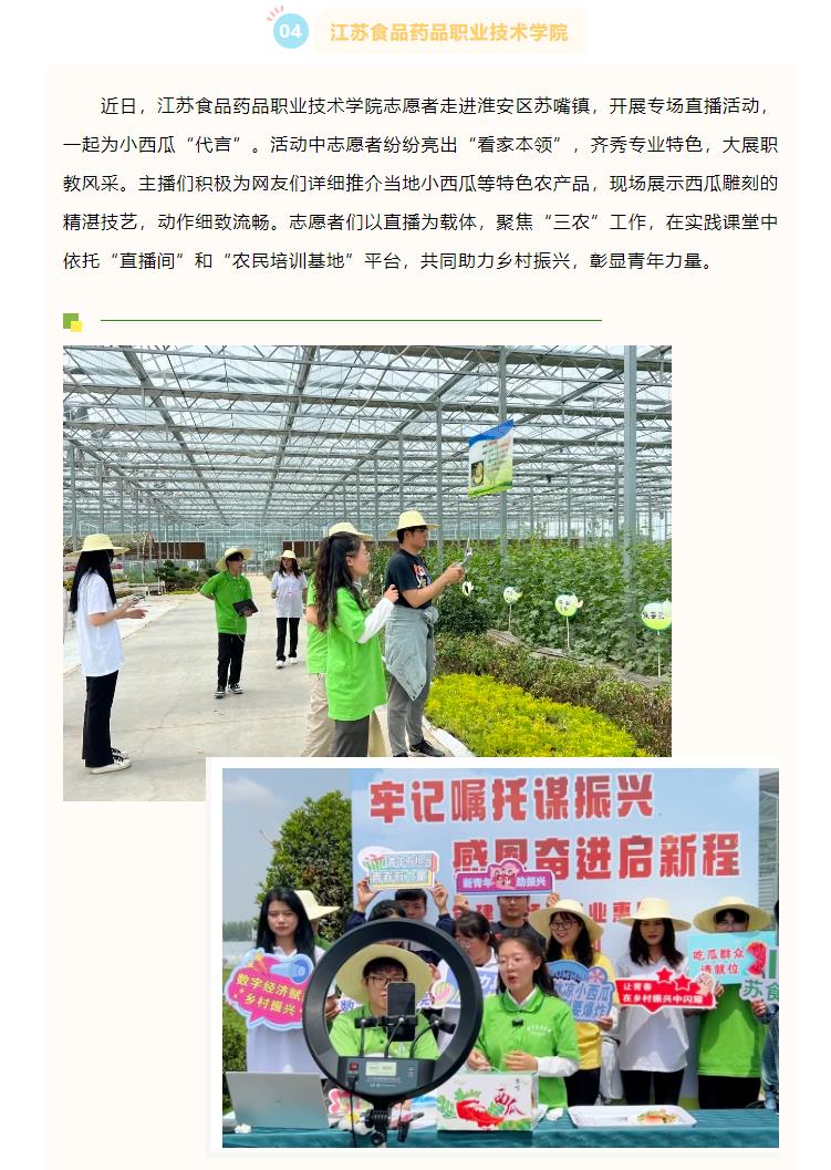 近日,乐竞志愿者走进淮安区苏嘴镇,开展专场直播活动,一起为小西瓜“代言”。活动中志愿者纷纷亮出“看家本领”,齐秀专业特色,大展职教风采。主播们积极为网友们详细推介当地小西瓜等特色农产品,现场展示西瓜雕刻的精湛技艺,动作细致流畅。志愿者们以直播为载体,聚焦“三农”工作,在实践课堂中依托“直播间”和“农民培训基地”平台,共同助力乡村振兴,彰显青年力量。