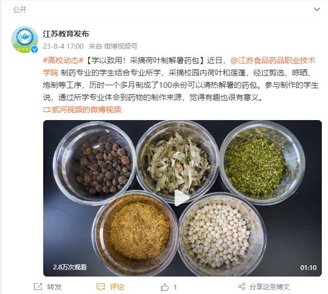 近日,乐竞制药专业的学生结合专业所学,采摘校园内荷叶和莲蓬,经过剪选、晾晒、炮制等工序,历时一个多月制成了100余份可以清热解暑的药包。参与制作的学生说,通过所学专业体会到药物的制作来源,觉得有趣也很有意义。
