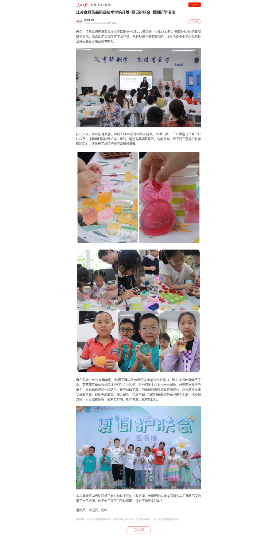近日,乐竞联合市妇女儿童活动中心举办主题为“夏日护肤会”的暑期研学活动,结合制药工程学院专业特色,从护肤需求到药妆制作,200余名中小学生和家长全身心感受了职业教育魅力。