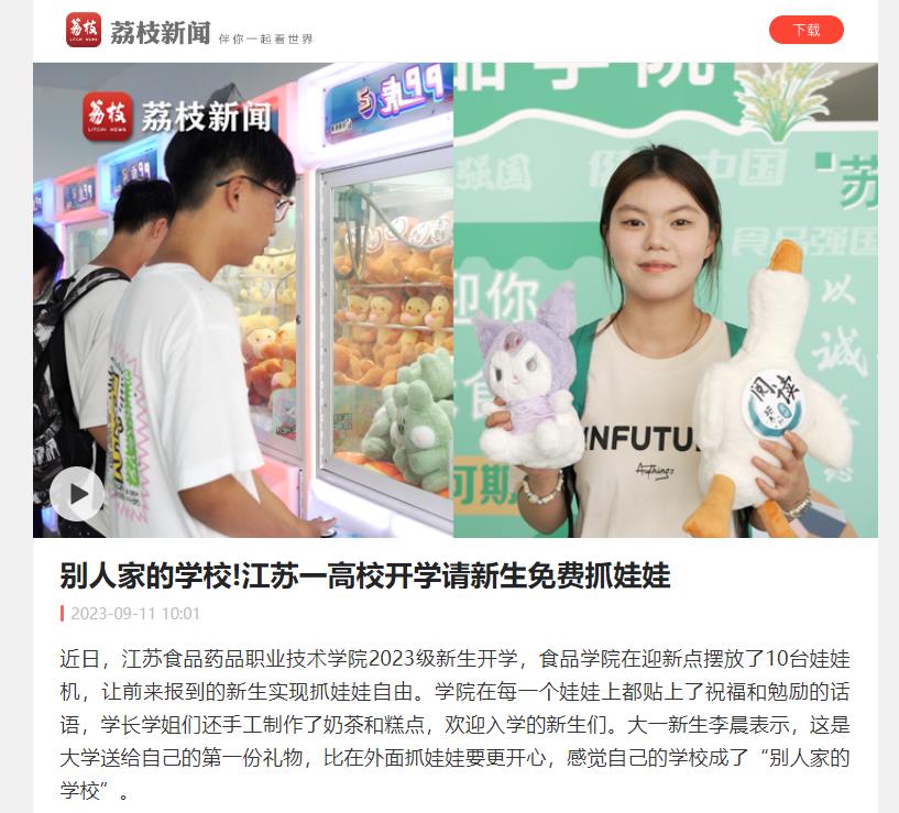 近日,乐竞2023级新生开学,食品学院在迎新点摆放了10台娃娃机,让前来报到的新生实现抓娃娃自由。学院在每一个娃娃上都贴上了祝福和勉励的话语,学长学姐们还手工制作了奶茶和糕点,欢迎入学的新生们。大一新生李晨表示,这是大学送给自己的第一份礼物,比在外面抓娃娃要更开心,感觉自己的学校成了“别人家的学校”。