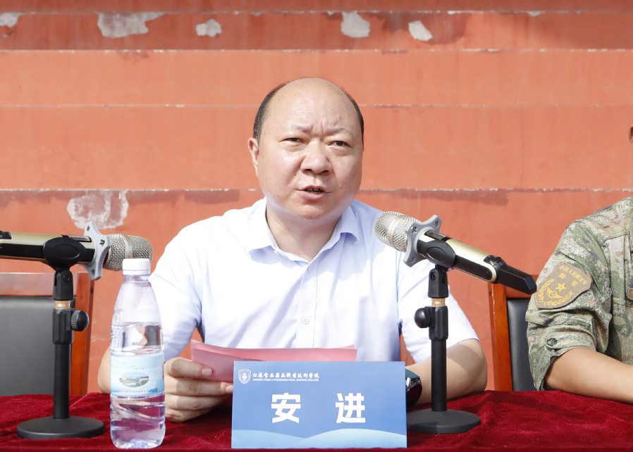 党委副书记安进在讲话中代表学校向73106部队全体承训教官辛苦付出表示衷心的感谢,向参加军训的师生致以崇高的敬意,向取得优异成绩、受到表彰的单位和个人表示热烈的祝贺。安进表示,全体新生按照军训计划,从严训练,在日晒风吹中铸就坚强,在挥洒汗水中收获成长,展现了乐竞新一届学子的良好精神风貌。他希望同学们把军训中收获的优良作风和意志品格贯穿到大学三年的学习生活中去,努力成长为社会主义事业的合格建设者和可靠接班人。