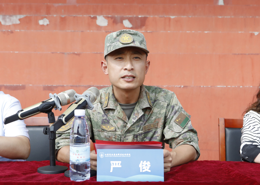 73106部队教导员严俊中校在讲话中代表全体承训官兵,对圆满完成军训任务的同学们表示热烈祝贺。他表示,全体参训学生刻苦训练、顽强拼搏,展现了当代大学生勇于实践、敢于吃苦、直面挑战的优秀品质和精神面貌,充分表现了苏食药院的优良传统。
