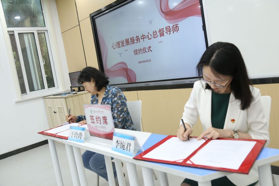 李婉君首先向于玲玲在过去两年里对乐竞学生心理危机干预工作和专兼职咨询师专业胜任力上给予的专业指导表示衷心感谢,并热切邀请于玲玲继续与乐竞心理中心合作。于玲玲表示,乐竞心理中心为淮安市高校专兼职咨询师的交流学习提供了一个开放的平台,不仅培养本校心理专业队伍,更是惠及到淮安市各兄弟院校。李婉君和于玲玲双方现场对接洽谈了聘任事宜,并达成共识,共同签署了聘任协议。